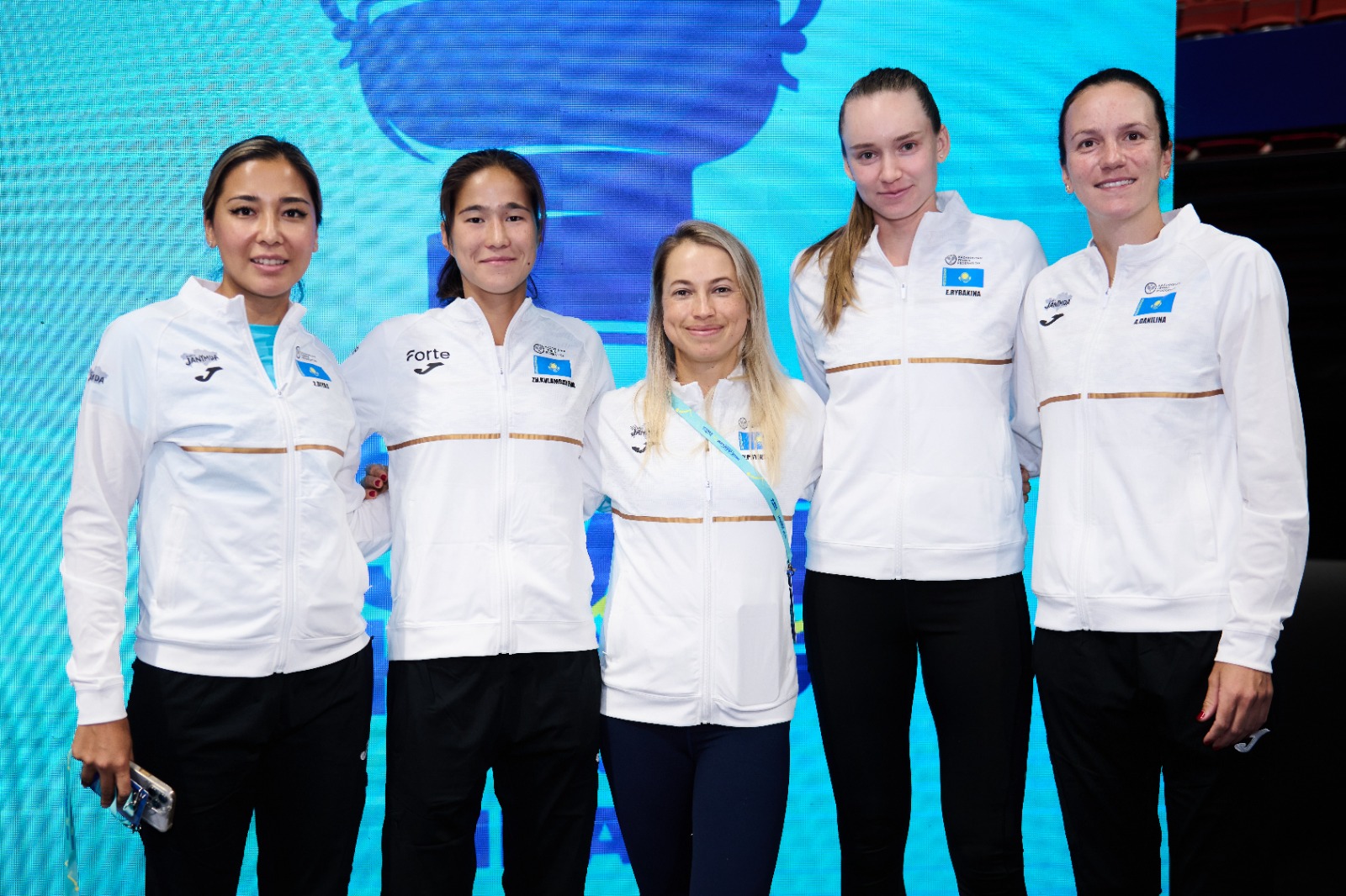 📸 Женская сборная Казахстана (слева направо): Зарина Дияс, Жибек Куламбаева, Юлия Путинцева, Елена Рыбакина и Анна Данилина. Здесь и далее фото: Андрей Ударцев/ФТК