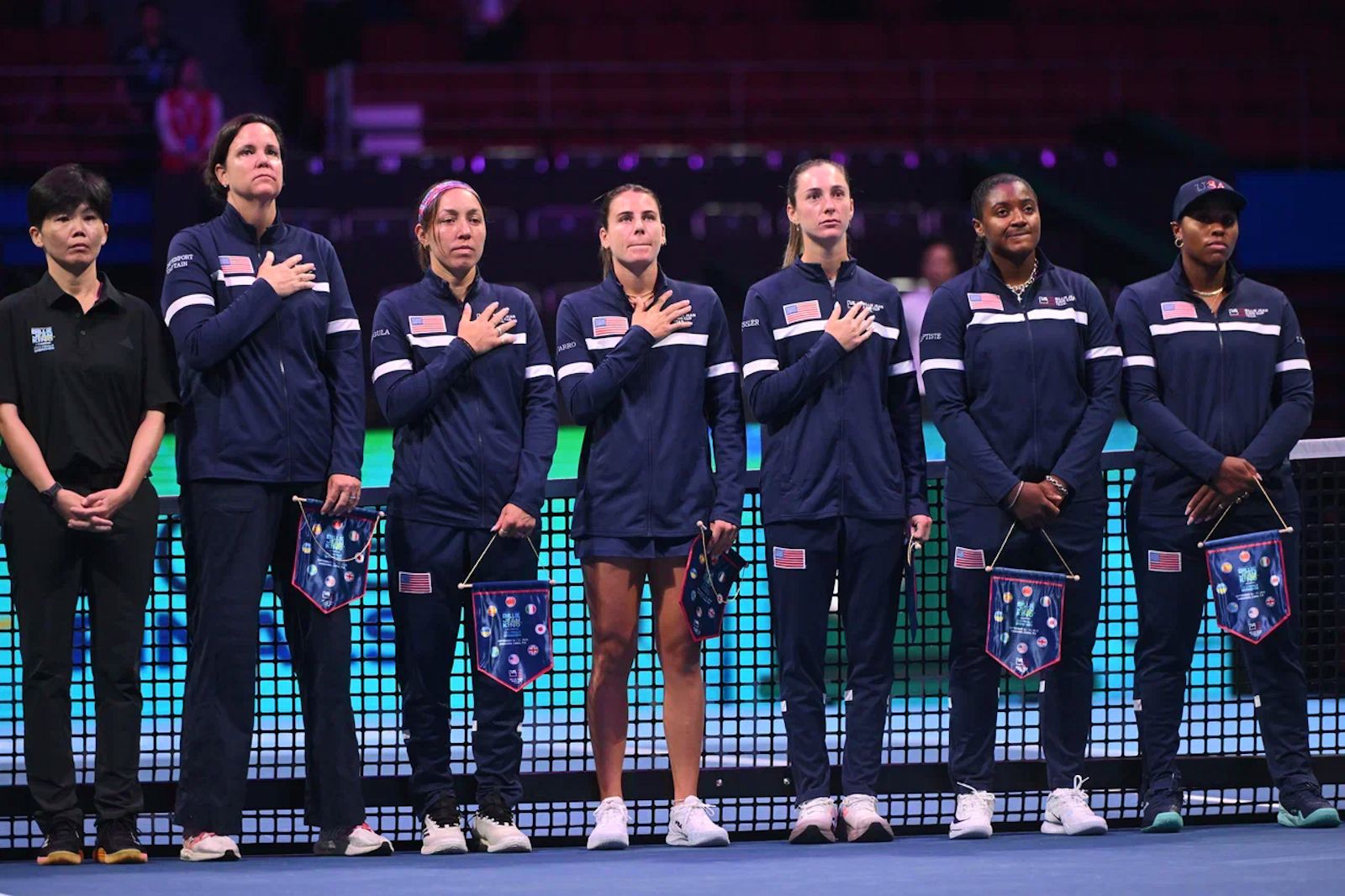 18 сентября 2025 года, 10.00 по местному времени (весь огромный Китай, как и Казахстан с недавних пор, живёт по одному времени, опережающему казахстанское на 3 часа), капитаны (главные тренеры) женских сборные США и Казахстана Линдси Дэвенпорт и Юрий Щукин выводят на площадку своих подопечных. После короткой церемонии открытия матча и исполнения государственных гимнов на корте под присмотром судьи на вышке Евы Асдераки-Мур остаются вторые номера команд Эмма Наварро (№ 18) и Юлия Путинцева (№ 61).